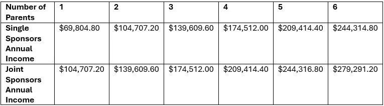 Financial Responsibility: The sponsor must meet certain income thresholds, which ensure they can financially support the parent(s). The thresholds a single sponsor must earn is at least the median wage ($33.56) to support 1 parent. Joint sponsors must earn an combined income no least than 1.5x the median wage to support 1 parent which is $104,707.20 NZD. For an additional parent, the income threshold increases 0.5x the median wage.